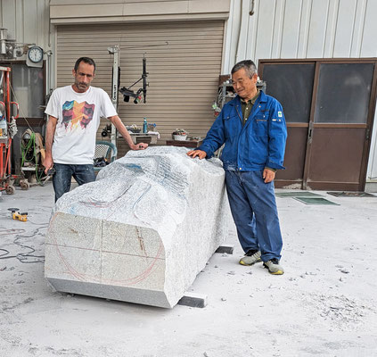 ストヤノフさんは、日本石材産業協会(東京都千代田区)から在日ブルガリア大使館を通じて招待され、昨年10月に来日。同協会に招待を提案した浅賀さん宅に約1か月滞在し、制作に打ち込んだ。作品を万博会場に展示しようと、浅賀さんが日本政府や同大使館と交渉を重ねて了承され、開幕前の今年3月に設置することにこぎ着けた。