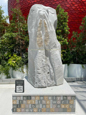 制作したのはイヴァン・ストヤノフさん(44)。ブルガリア国立アカデミー大学院を修了し、石彫だけでなく油絵や木彫でも活躍する。「平和への祈り」と名付けられた今回の作品は、高さ約2メートル、重さ約6トンで、合掌しているような形になっている。高さ約50センチの台座には「世界が永遠に平和でありますように」と日本語と英語で刻まれているほか、石岡市産の御影石を使用したことも記されている。